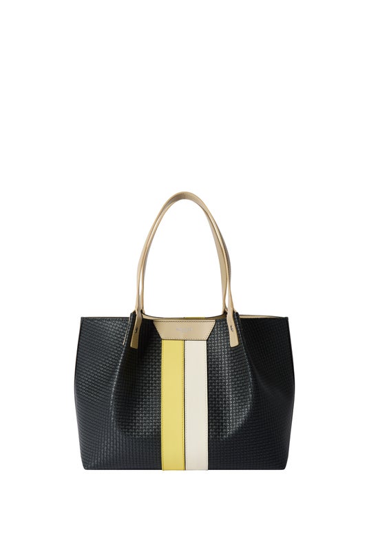 持ち手とボディが独特の方法で取り付けられており、他には無いシルエットを生み出すとともに、肩掛けした際にすっきりと体に沿うデザインとなっています。 非常に軽い上、広い開口部と内部中央のジップ付きコンパートメントで実用性も抜群です。