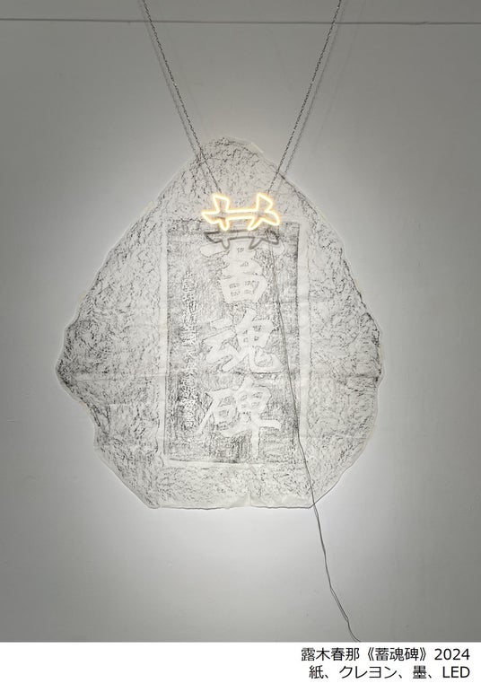 漢字や文字がもつ歴史文化に深い関心をもつ露木は、自身の祖母の体験から着想し、沖縄から台湾への疎開というテーマで文献調査や聞き取りを行いました。自身に深く刺さったエピソードや理解に苦しんだ経験を中心に、疎開した人々やそれを受け入れた(あるいは受け入れ切れなかった)人々が残した文字を通じて、文字と人間の心が共鳴する空間を表現します。