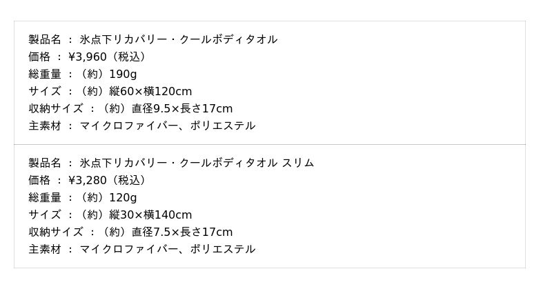 「氷点下リカバリー・クールボディタオル」は、全身をしっかり包み込める120×60cmの大型サイズで、「氷点下リカバリー・クールボディタオル スリム」は、首や頭に巻いたり、帽子に挟んだりと様々シーンに使いやすい140×30cmのスリムロングサイズです。生地には吸水性・速乾性に優れたマイクロファイバー素材を採用しており、水分をしっかり吸収します。洗濯後はスピーディーに乾くほか、軽量でコンパクトなので持ち運びも便利です。