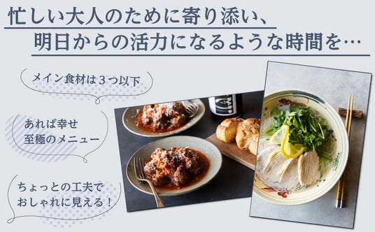 ひとりの大切な時間にも、家族とのゆったり時間にも、好きな人たちと集まって楽しむ時間にも、寄り添ってくれる料理が必ずあります。