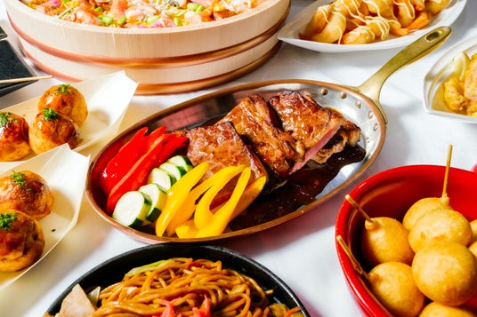<料理>キハダマグロのタタキ/野菜とトマトの冷製ガスパチョ/アボカドとシーフードのハワイアンサラダ/カップシェイクサラダ 各種ドレッシング添え/鶏ハムのサラダ/ちらし寿し/枝豆/焼きとうもろこし/串カツ/海老マヨチリソース/イカのフリット/チーズと蜂蜜のピザパイ/タコさんソーセージとトルティーヤ サルサソース/チーズドッグ/ミニハンバーグ/大野醬油の唐揚げ/夏野菜カレーとガーリックライス/タコ焼き舟盛/焼きそば(ライブキッチン※土日祝はブッフェ台での提供)/牛ロースステーキ(ライブキッチン※土日祝限定)