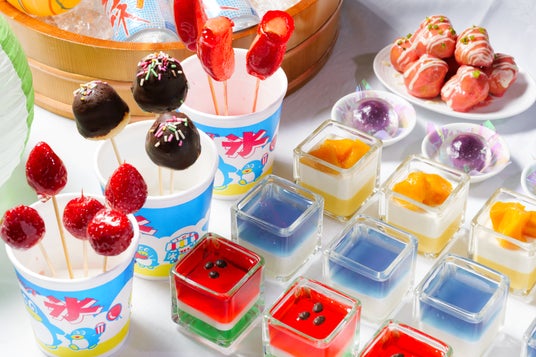 デザートコーナーには、「苺とりんごのべっこう飴」や「かき氷」、桶に冷やした「ラムネの瓶ジュース」など、お祭りの屋台を連想させるユニークなスイーツが勢ぞろい。ホテル金沢の山岸パティシエが、見てたのしい食べておいしいスイーツを考案しました。ぜひお子さま自身でひとつひとつ手に取っていただき、夏祭りの没入体験をお楽しみください。