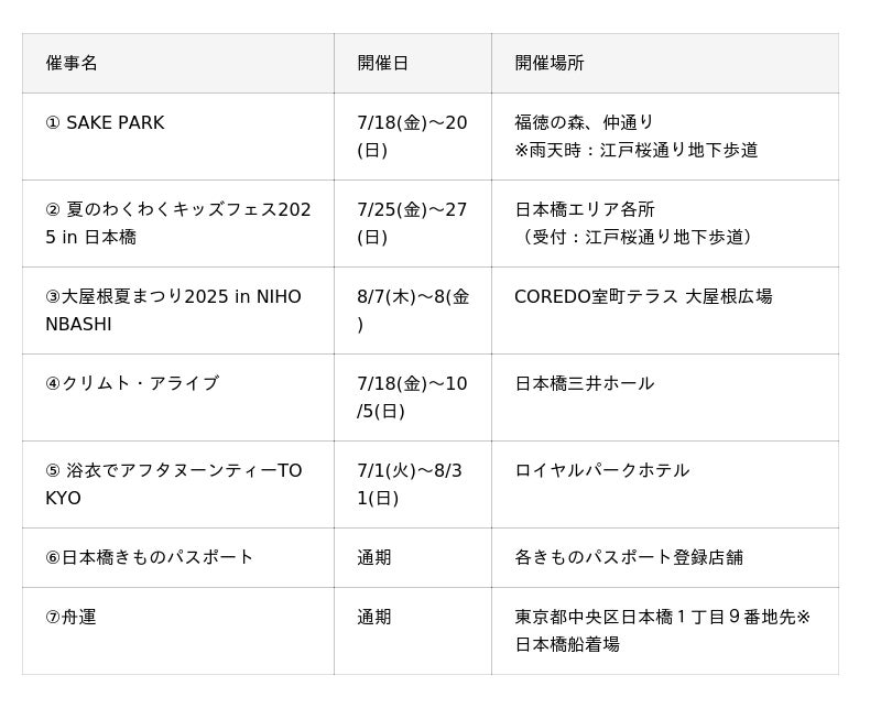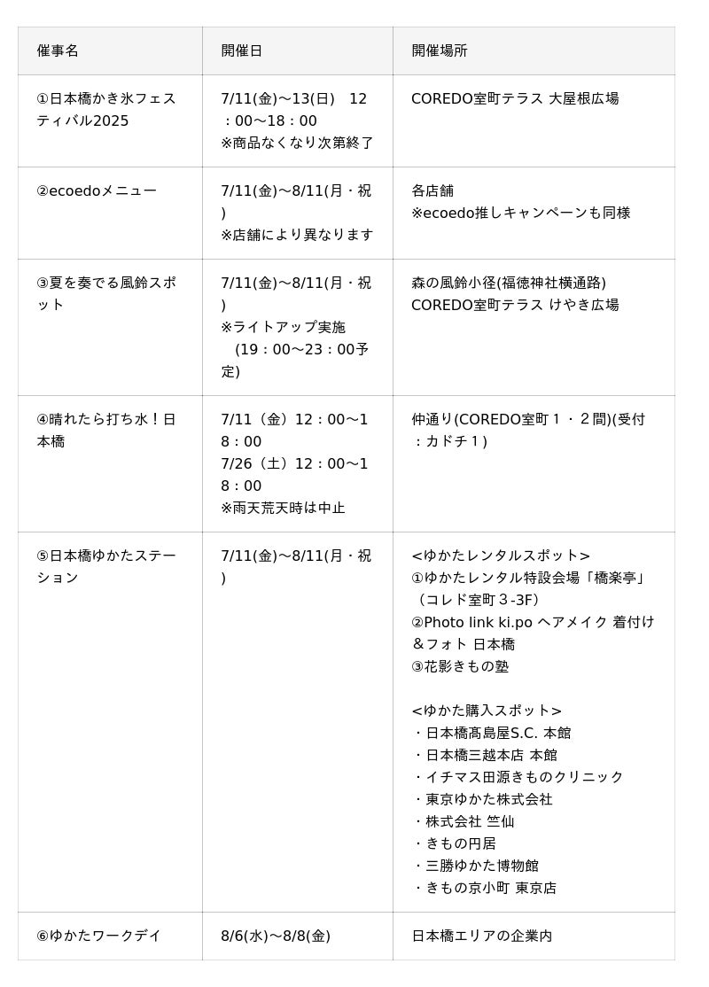 一般社団法人日本橋室町エリアマネジメントは、名橋「日本橋」保存会とともに日本橋、八重洲、京橋エリアにおいて、2025年7月11日(金)から8月11日(月・祝)に、江戸時代から育まれた日本橋らしい涼体験をお届けするイベント『ECO EDO 日本橋 2025 ~五感で楽しむ、江戸の涼~』を開催します。