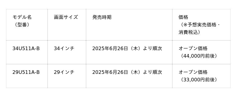 IPSパネル採用、21:9ウルトラワイド(TM)モニター「34U511A-B」と「29U511A-B」を本日6/26より順次発売