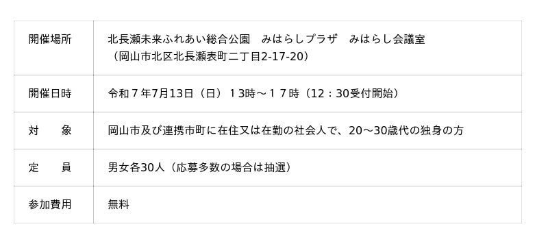 [結婚に向けて一歩踏み出す/魅力アップセミナー&プチ交流会] - 岡山市及び連携市町主催、令和7年7月13日(日)13時~17時に開催