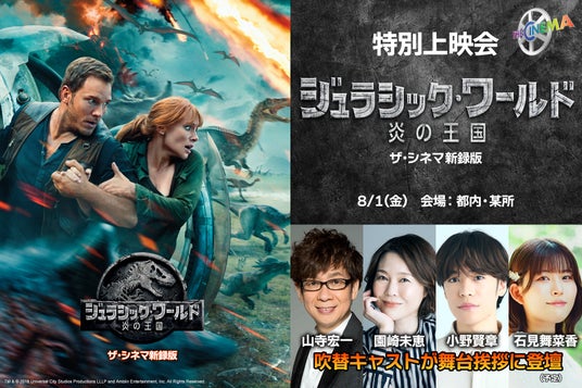 シリーズ2作目(2018年公開)『ジュラシック・ワールド/炎の王国【ザ・シネマ新録版】』を大スクリーンでお披露目!舞台挨拶付き特別上映会の開催が決定!8月1日(金)に都内某所にてオーウェン役山寺宏一さん、クレア役園崎未恵さん、フランクリン役小野賢章さん、メイジー役石見舞菜香さんが登壇予定!収録の裏話や、観て欲しいポイントなどが聞けるトークイベント、さらに豪華賞品が当たる抽選会など盛りだくさんでお届けいたします。たくさんのご応募をお待ちしております!