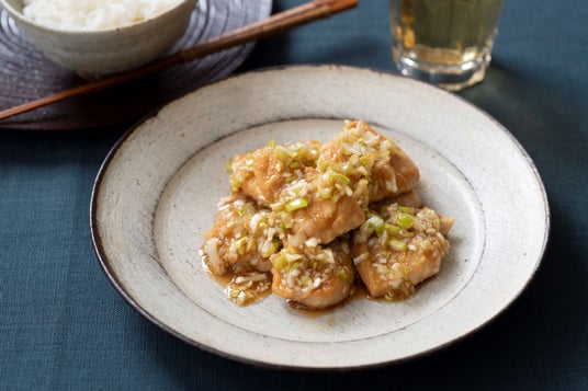 「みじん切りのねぎ1本、しょうゆ大さじ2、酢・砂糖各小さじ4、紹興酒・ごま油各小さじ2をまぜる。鶏胸肉1枚を7mm厚さのそぎ切りにして軽く塩をふり、小麦粉をまぶす。サラダ油少々を熱して両面を焼き、たれに漬ける」