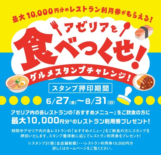 アゼリア内の各レストランの「おすすめメニュー」をご注文した方にスタンプを押印いたします。スタンプ獲得数に応じて最大10,000円分(※)のレストラン利用券をプレゼントいたします。