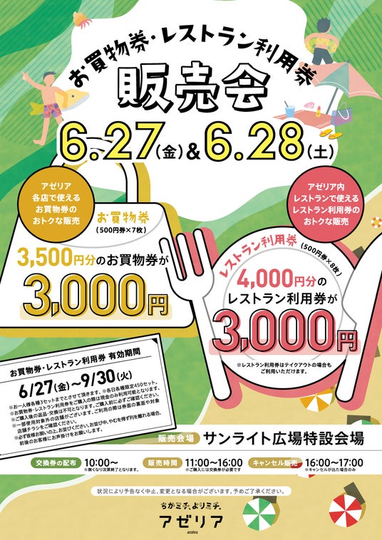アゼリア内各店で使えるお買物券と、アゼリア内レストラン店舗で使えるレストラン利用券のお得な販売会を実施いたします。お買物券は3,500円分を3,000円で、レストラン利用券は4,000円分を3,000円で購入することができ、購入当日からご使用いただけます。