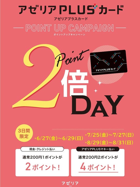 アゼリアPLUSカードポイントが通常の2倍付与されるポイントアップキャンペーンを開催いたします。