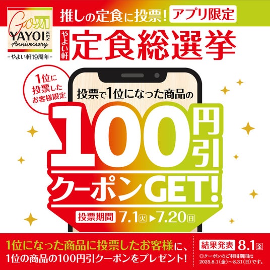 このたび日本国内の「やよい軒」では、19周年を記念して7月1日(火)より、人気定食8商品の中から"推し定食"に投票いただく『やよい軒 定食総選挙』を、公式アプリ内にて実施いたします。ご投票いただいたお客様の中から、1位に選ばれた定食にご投票いただいた方全員に、1位の定食が100円引きとなるクーポンをプレゼント。さらに、投票いただいた方の中から抽選で10名様に、やよい軒お食事券10,000円分が当たります。また、7月1日(火)~7月7日(月)の期間中、やよい軒公式X、Instagramにて『19周年Anniversary』キャンペーンも同時開催いたします。奮ってご参加ください。