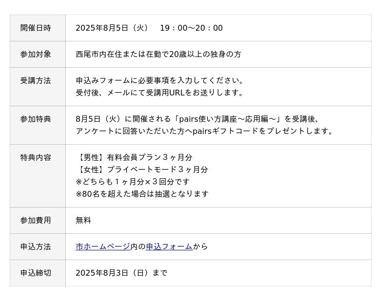 西尾市と事業連携協定を締結している株式会社エウレカ(本社:東京都港区)が運営する、国内最大級のマッチングアプリ「ペアーズ」のギフトコードのプレゼントを実施し、オンラインによる新たな出会いを創出します。
