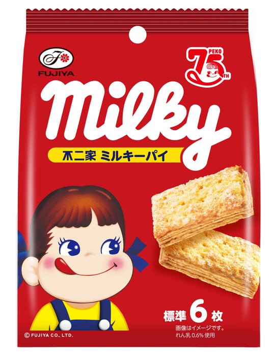 不二家のマスコットキャラクターであるペコちゃんは1950年(昭和25年)に誕生しました。そんなペコちゃんの生誕75周年を記念し、不二家のロングセラー「ミルキー」の味わいをパイで表現した商品が期間限定で登場します。
