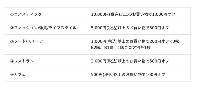 コスメなど通常セールにならない商品もお得に購入可能な「PARTY COUPON」を最大2,700円分プレゼントします。さらに、対象クーポンを3枚以上ご利用いただいた方の中から抽選で100名さまに1,000ポイント*、200名さまに500ポイント*をそれぞれプレゼントします。*本施設のみで利用可能な「SCRAMBLE POINT(スクランブルポイント)」