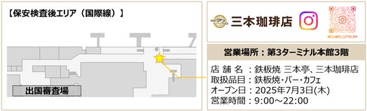 2025年7月3日(木)、第3ターミナル本館3階保安検査後エリア(国際線)に鉄板焼き・BAR・カフェの3業態が一体になった飲食店「鉄板焼 三本亭/三本珈琲店」がオープンいたします。