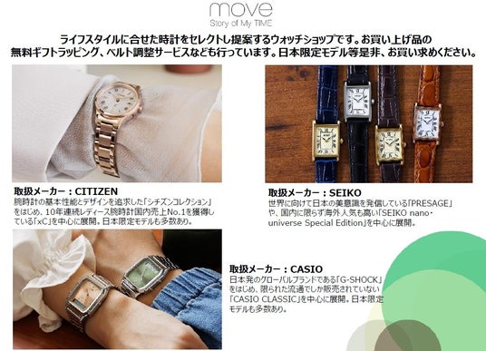 「move(ムーヴ)」は、ライフスタイルに合せた時計をセレクトしたウォッチショップ。"CITIZEN・SEIKO・CASIO"など日本ブランドを中心に、日本でしか買えないモデルも豊富に取り揃えております。