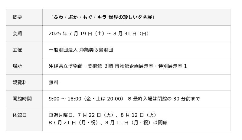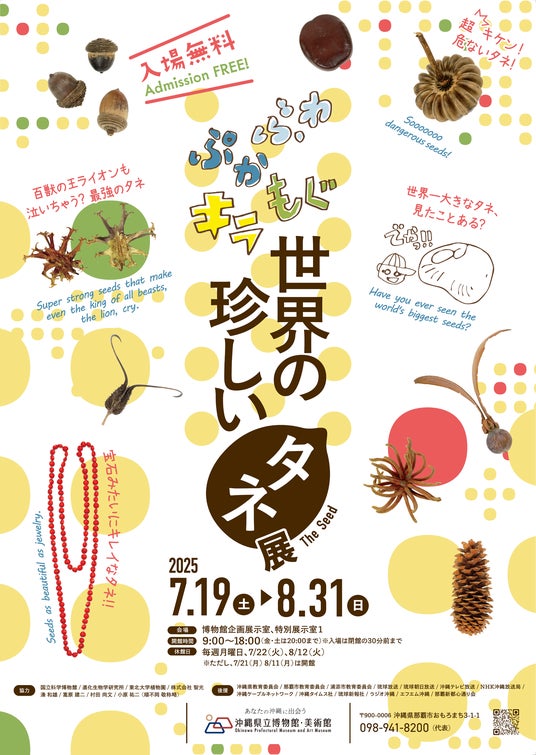 沖縄県立博物館・美術館(おきみゅー)では、7 月 19 日(土)より、企画展「ふわ・ぷか・もぐ・ キラ 世界の珍しいタネ展」(主催:一般財団法人 沖縄美ら島財団)を開催いたします。本展では、世界各地のユニークな植物のタネを取り上げ、その大きさや形、さまざまな散布方 法に焦点を当ててご紹介いたします。さらに、人々の暮らしとタネとの関わりにも注目し、普段 は見過ごしがちな "タネ" の奥深い魅力を、子どもから大人まで楽しめる内容でお届けいたします。入場無料で、夏休みの自由研究にもおすすめです。つきましては、ぜひ展覧会の周知にご協力賜りますようお願い申し上げます。