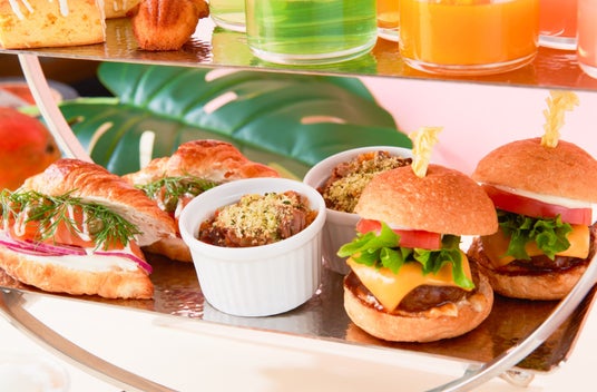 下段の食事系セイボリーにも、ひと工夫を添えた品々をご用意。「クリームチーズとサーモンのクロワッサンサンド」は、クロワッサンと塩味の効いたサーモン、爽やかなクリームチーズが相性抜群。「ビーフトマト煮込みプロヴァンス風」はやわらかく煮込んだ牛肉に完熟トマトの香りが広がり、スイーツの合間にうれしい、旨味とコクのある贅沢な一品。「和牛スマッシュチーズバーガー」は香ばしく焼き上げたパティとチーズの旨味を感じられ、ホテルならではの本格派ミニバーガーです。