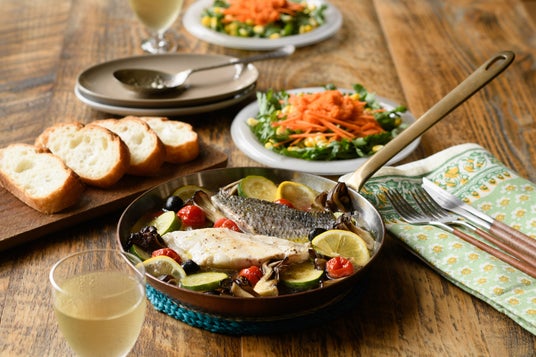 ▲岡山県産クロダイと夏野菜のアクアパッツァと自家製にんじんトレッシングのサラダ(おやさい献立おためしセットで販売)