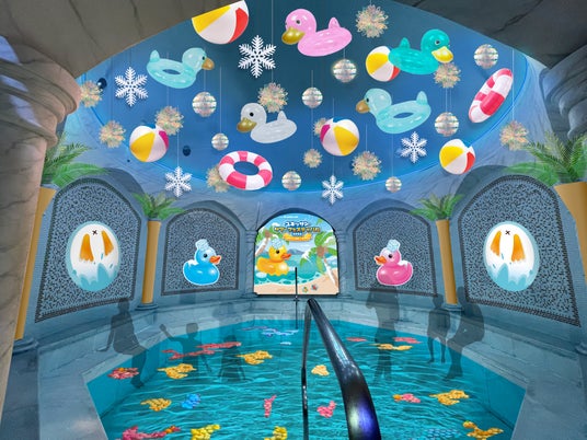 「ダック!ダック!ブリザードビーチ風呂」アヒルたちが楽しむ真夏のビーチに、季節外れのブリザードが!爆風が吹き荒れる"冷たい温泉"をどうぞお楽しみに!