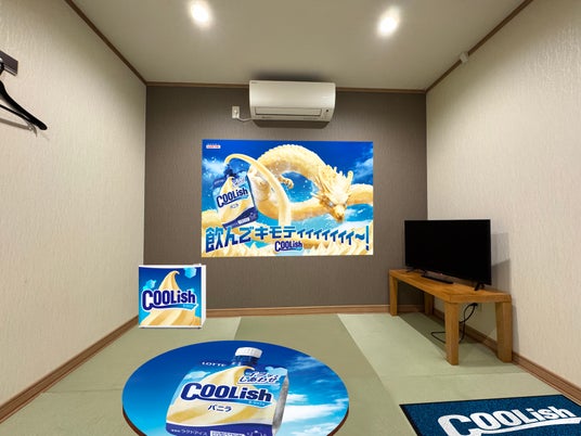 さらに、ロッカールーム内のシャワーブースの一部には「く~りっし湯 シャンプーセット(シャンプー・コンディショナー・ボディソープ)を設置。メンソール配合で清涼感が感じられ、バニラの香りがお楽しみいただけます。加えて全7室有料休憩室のうち3室を、ユネッサン初のコラボルーム「クーリッシュルーム」として販売いたします。客室内に設置する「クーリッシュ専用冷凍庫」には、6個の「クーリッシュ」をご用意。ご利用中は、いつでも好きなタイミングで、さまざまなフレーバーの「クーリッシュ」をご賞味いただけます。