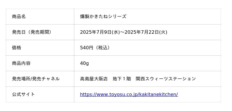 とよす株式会社(本社:大阪府池田市 社長:眞田 昌彦)は、百貨店を中心に展開している柿の種専門店「かきたねキッチン」の新商品『燻製かきたねシリーズ』を、高島屋大阪店 地下1階「関西スウィーツステーション」にて、2025年7月9日(水)から7月22日(火)までの期間限定で販売いたします。