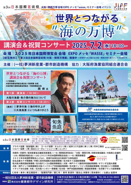 さらに、同会場内セミナー会場において、「第3回日本国際芸術祭/大阪・関西万博展」を盛り上げる様々なイベントを開催し、7月2日(水)には、大阪府漁業協同組合連合会による世界とつながる "海の万博" 講演会&祝賀コンサートを行います。