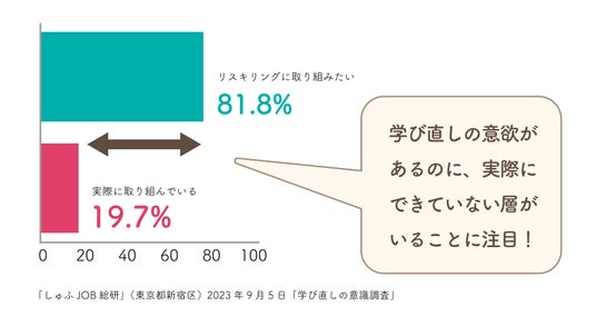 政府は現在、リスキリング支援として5年間で1兆円を投資する方針を掲げています。そのなかでも主婦層の「学び直し」ニーズは高く、81.8%が関心を示す一方で、実践しているのはわずか19.7%というギャップが存在しています(しゅふJOB総研調査 2023年)。