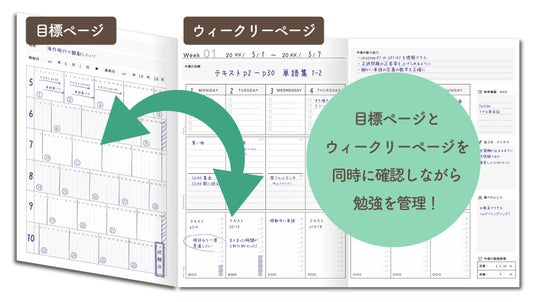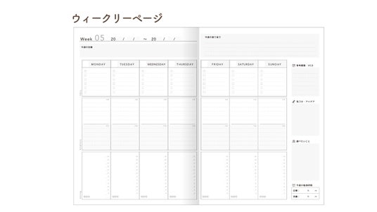 手帳が紙であることの利点を最大限に活かした見開きデザイン。折りたたんで収納できる「目標ページ」は、「ウィークリーページ」と同時に開いて見渡すことが可能