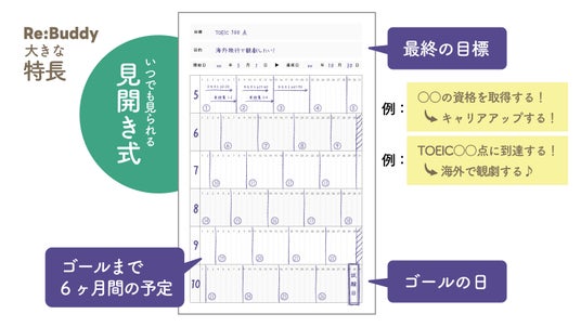 「Re:Buddy」は、神戸大学経済学部・吉田ゼミに所属する学生3名(黒田康介、森 若菜、石原理暉)が考案し、伊藤手帳が商品化した、家事や育児と両立しながら資格取得を目指す人に向けて、逆算スケジュールや達成度の見える化といった独自の機能を盛り込んだ"リスキリング"手帳です。