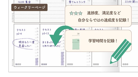 ★マークを塗り、毎日の達成度を記録。グラフには学習時間を記録し、モチベーションの向上・維持につなげる仕組み