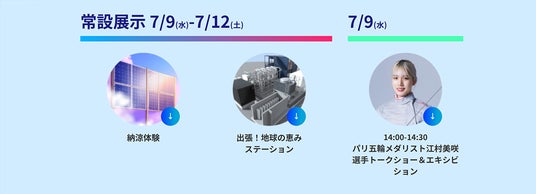 また、期間中は「出張!地球の恵みステーション」「納涼体験」をリボーンステージに出展。「地球の恵みステーション」公式スタンプの設置や、垂直ソーラー発電システム「VERPA(ヴァルパ)」を使用した納涼空間を常設しています。