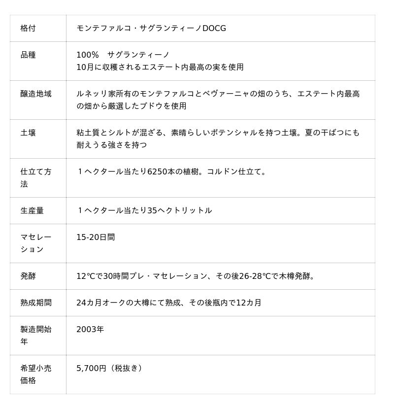 サグランティーノ特有の力強さと長期熟成のポテンシャルという絶対的にユニークな特徴を持つこのワインは、巧みなブドウ栽培技術とオークの大樽で熟成した賜物です。凝縮され際立った深く輝くルビー色、サグランティーノらしい印象的なブラックベリー・ジャムやブルーベリーの香りにブランデー漬けのチェリーやバラの花びらの魅力的な香り。チョコレートやリコリスのような香りも感じとることができます。クリーミーなテクスチャ、パワフルで芳醇な果実味、余韻はとても長く、類稀なるフィネスとタンニンを感じることが出来る、非常にエレガントで繊細なワインです。