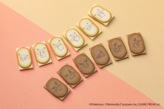 『はみ出しチョコのクッキーサンド』は、バナナヨーグルト味とキャラメルマキアート味の2つのおいしさをIN。バナナヨーグルトチョコレートをサンドしたクッキーにはピカチュウの絵柄を、キャラメルマキアートチョコレートをサンドしたクッキーにはイーブイの絵柄をそれぞれ描いています。シャリシャリッと軽やかに香ばしく焼きあげたラングドシャクッキーにショコラを思いっきりはみ出すことで、ショコラの存在感もサクサクのクッキーも一緒にお楽しみいただけます。