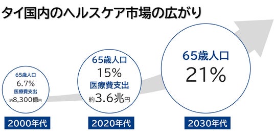 「若い地域」と見なされがちなASEAN諸国でも、高齢化は確実に進行し、タイはその最前線に立っています。2024年時点で65歳以上の人口は全体の15%を超え、2030年代前半には21%を突破して「超高齢社会」へと突入する見込みです。医療費支出も急増し、2021年には約8,300億バーツ(約3.6兆円)に達しました。こうした状況は、健康・医療・介護といった分野で、日本のヘルスケア産業の知見を活かせる新たな市場機会の広がりを示しています。
