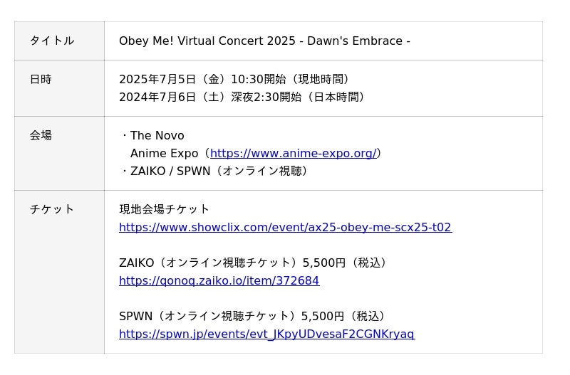 株式会社 NTT QONOQ(以下、コノキュー)は、NTTソルマーレ株式会社(以下、ソルマーレ)と合同で、アメリカ合衆国カリフォルニア州ロサンゼルスのダウンタウンの中心部で毎年独立記念日に開催される大規模なアニメイベント「Anime Expo(R)」内で、ソルマーレの保有するIPである「Obey Me!」シリーズとして3Dバーチャルライブとサイン会を開催します。