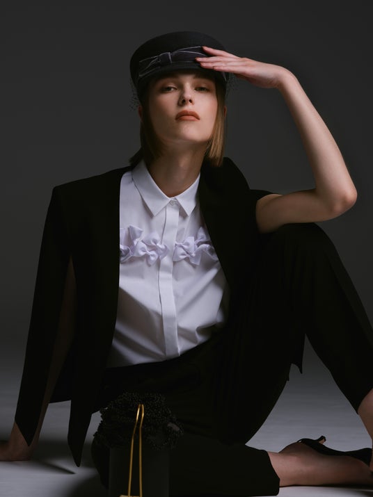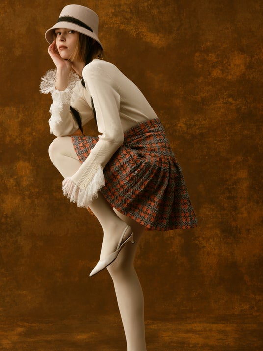 Pullover ¥36,300 / Skirt ¥99,000 / Hat ¥20,900 / Shoes ¥19,800