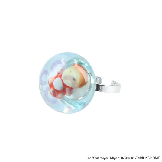 クラゲのなかでうたた寝しているポニョが印象的なリングです。クラゲの透明感を活かした不思議なモチーフが涼しげで、身に着けるだけでコーディネートのアクセントになります。