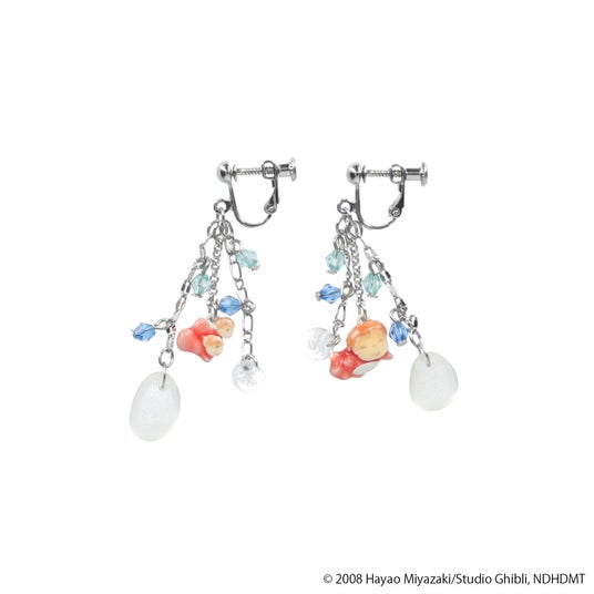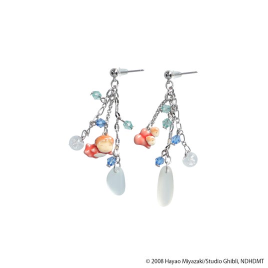 にっこりとほほ笑むポニョといもうとたちのモチーフがセットになった、イヤリングとピアスです。『崖の上のポニョ』の世界観に合わせて、ポニョたちが海で泳いでいる姿をイメージした耳元でゆれる仕様や、シーグラス風のガラスを使用するなど素材選びにこだわりました。