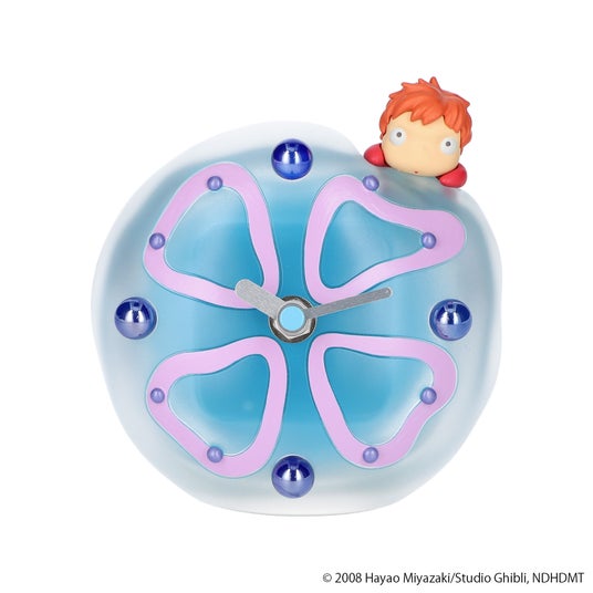 文字盤の4箇所に本物のビー玉を使用し、クリアなクラゲの質感にこだわった『崖の上のポニョ』の置時計です。ポニョとクラゲの質感の違いを引き立てるポニョのポージングと、クラゲの形状にこだわりました。