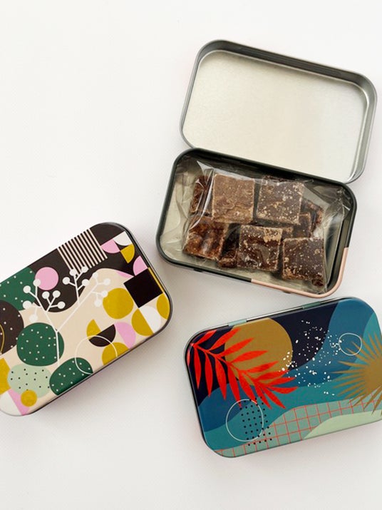沖縄黒糖チョコリシャス⽸3缶セット・レトロ感、高級感あふれる缶は、手の平サイズで持ち歩きができ、食べ終わった後には小物入れとしてお使いいただけます。