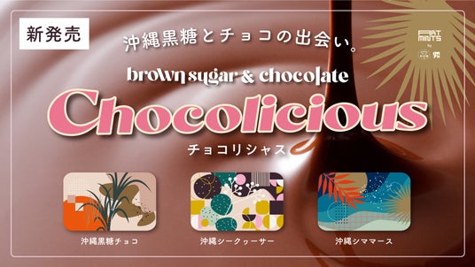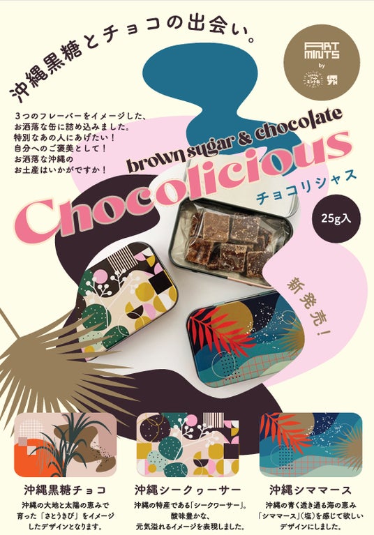 「沖縄黒糖チョコリシャス」とは、"黒糖"に"チョコレート"そして「美味しい」の"デリシャス"を掛け合わせた造語となります。黒糖とチョコレートが織りなす、豊かで奥深い味わいをお楽しみいただけます。今回フレーバーは3種類ご用意しました。沖縄らしさを詰め込んだ「黒糖チョコレート味」「シークヮーサー味」「シママース(塩)味」。それぞれの沖縄特産素材をイメージしたパッケージは、これまでにない、新しい「沖縄らしさ」を表現したデザイン缶に仕上げました。