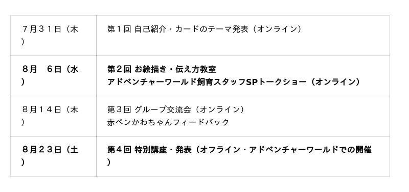 メインプログラムでは、子どもたちが自分の"好き"な生き物について調べ、描き、言葉にして伝えることで、世界に一つだけの「カード図鑑」づくりに挑戦します。探究力・表現力・コミュニケーション力を育みながら、夏休みの自由研究としても充実した内容です。2025年8月6日(水)にオンラインにてペンギンとイルカの飼育スタッフがトークショーを行う他、実習生の発表会を8月23日(土)にパーク内で開催いたします。
