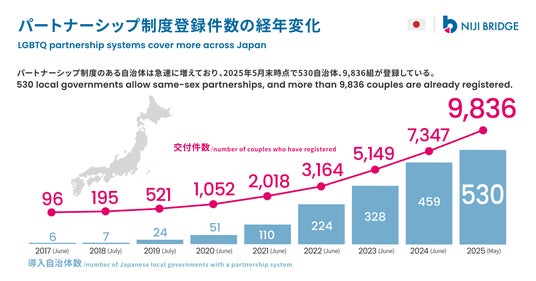 渋谷区(区長:長谷部 健)と認定NPO法人虹色ダイバーシティ(所在地:大阪市北区、理事長:村木 真紀)は、全国の地方自治体のパートナーシップ制度登録件数の最新数値を調査し、2025年5月31日時点の導入自治体・登録件数・人口カバーや推移グラフなどをNIJI BRIDGEと渋谷区のホームページにて公開しました。