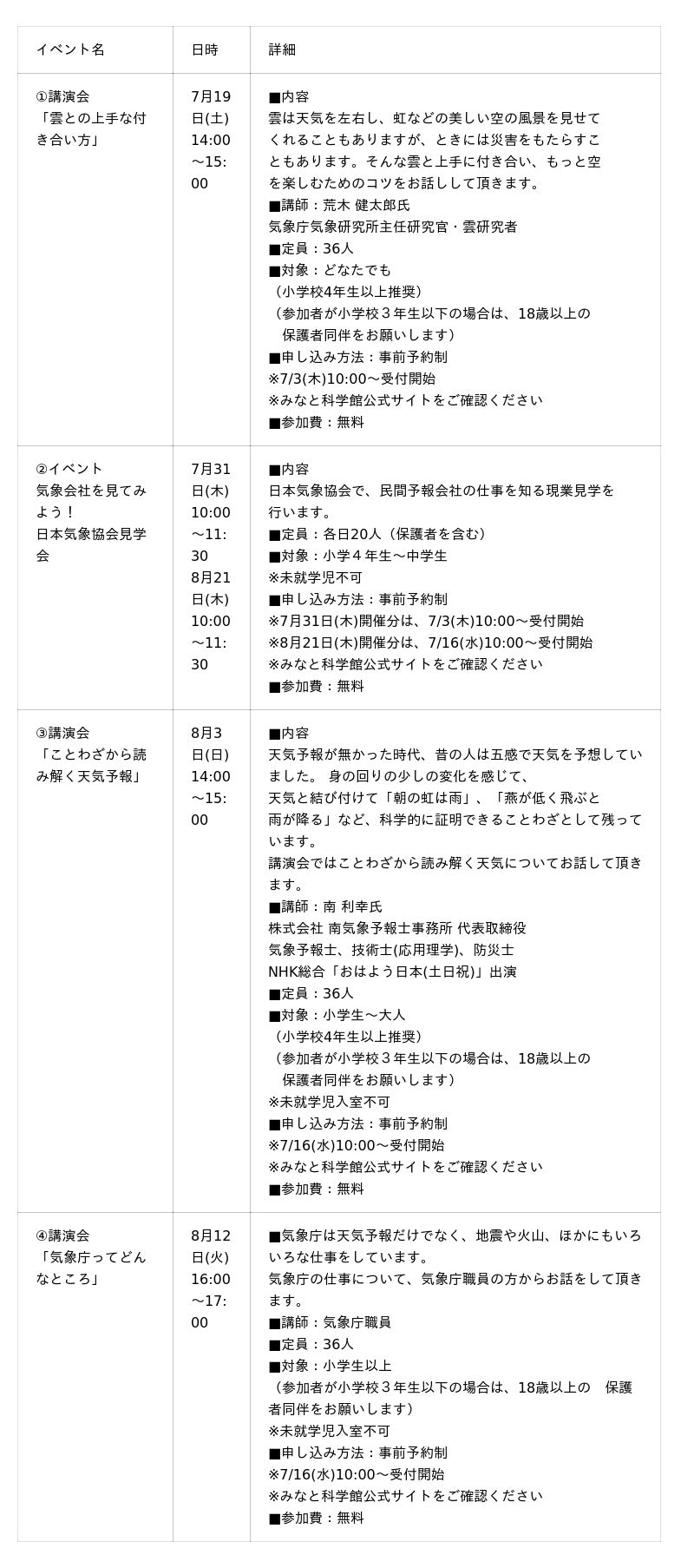 その他、気象庁気象研究所の雲研究者である荒木健太郎氏の講演会や気象キャスターの南利幸氏の講演会、今回の企画展に合わせて制作したみなと科学館でしか見られないオリジナルプラネタリウム番組の投影など、関連イベントも盛り沢山。ぜひこの機会にご来館ください。