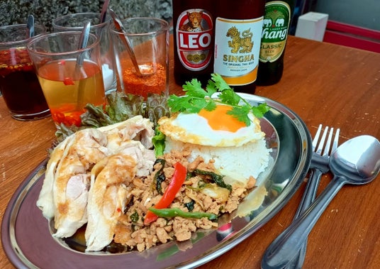 カオマンガイ、ガパオ、グリーンカレー、パッタイ、クンパッポンカリーなど、定番から現地色の強いメニューまで揃え、1種盛り(¥1000)から最大4種盛り(¥1600)まで選べるカスタマイズ式です。