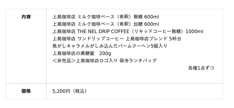『上島珈琲店』の味わいがおうちでも楽しめる、『上島珈琲店』の店舗や公式ECでしか買えないアイテムを中心に、詰め合わせました。コーヒーと合わせて楽しみたい『焦がしキャラメルがしみこんだバームクーヘン』も入って夏のピクニックにもおすすめ。