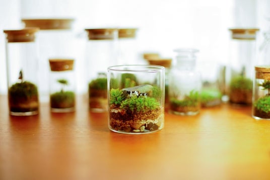 「苔テラリウム」は、ガラス容器の中に苔や小さな植物、石やフィギュアなどを配置して、自然風景を再現する癒しのインテリア作品です。