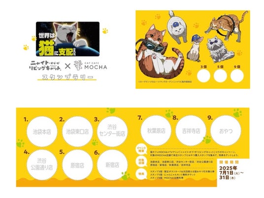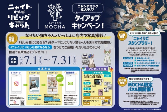 「猫と過ごす、豊かなひととき」をコンセプトとし、全国に猫カフェを展開するリポット株式会社(本社:東京都新宿区、代表取締役:岩崎康二)は、7月7日より順次アニメの放送・配信がスタートする『ニャイト・オブ・ザ・リビングキャット』との猫づくしなタイアップイベントを、全国35店舗の猫カフェMOCHAで、2025年7月1日(火)~31日(木)まで開催いたします。
