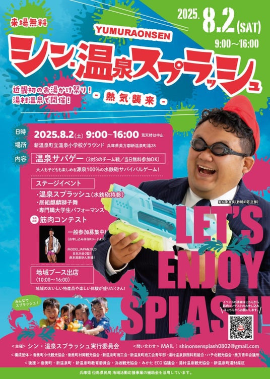 本イベントでは、近畿初開催となる大規模「お湯掛け祭」。初年度となる今回は約5,000人の来場を見込んでいますが、今後は1万人規模の恒例イベントとしての定着を目指します。98度の源泉を使用した新温泉町の「湯村温泉」を舞台に子どもから大人も楽しめる温水での水鉄砲合戦「温泉サバゲー」や「温水撒き」、「筋肉コンテスト」などの五感を刺激するユニークな企画が目白押しです。